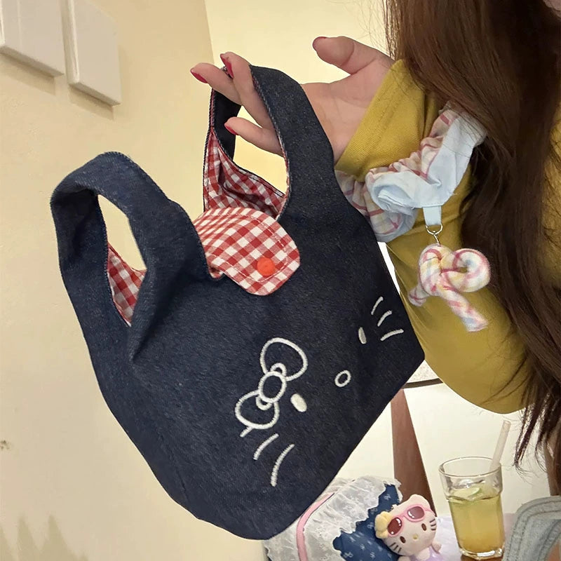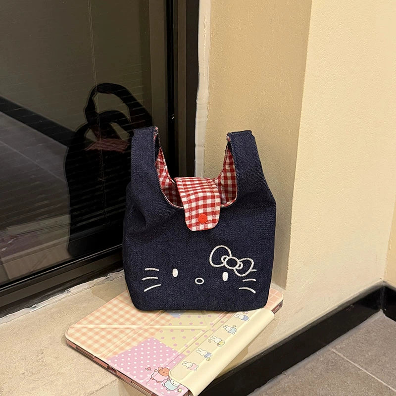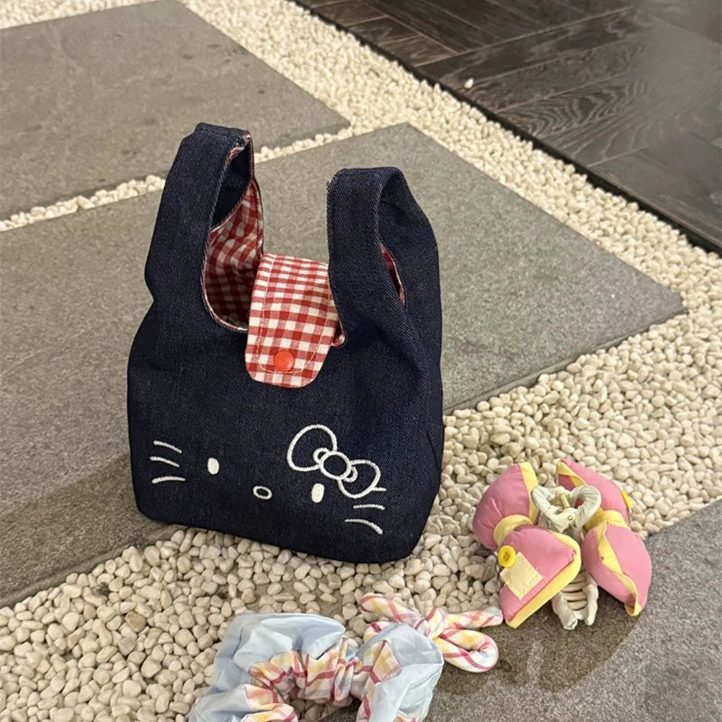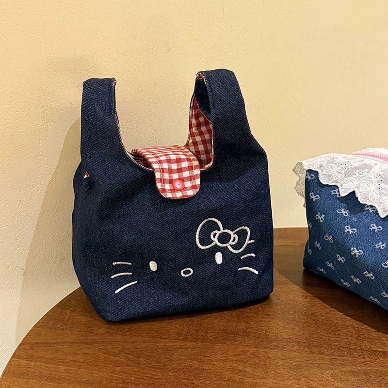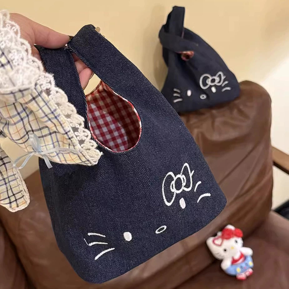 Adorable cartoon kitty embroidered denim wrist bag, plaid design for commuter lunch box storage.