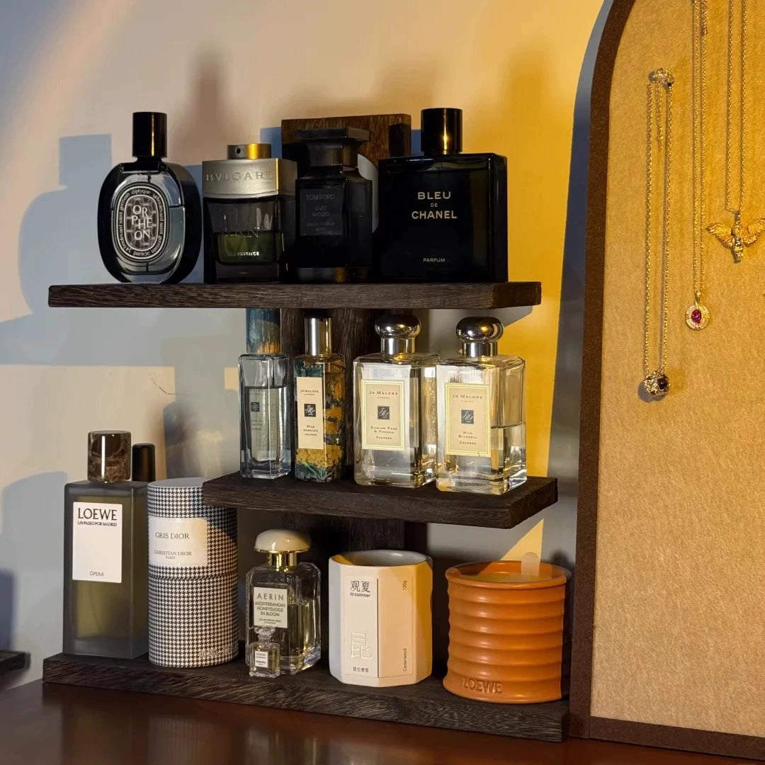 Multi-layer medieval-style solid wood perfume display rack for desktop cosmetics and aromatherapy storage.
