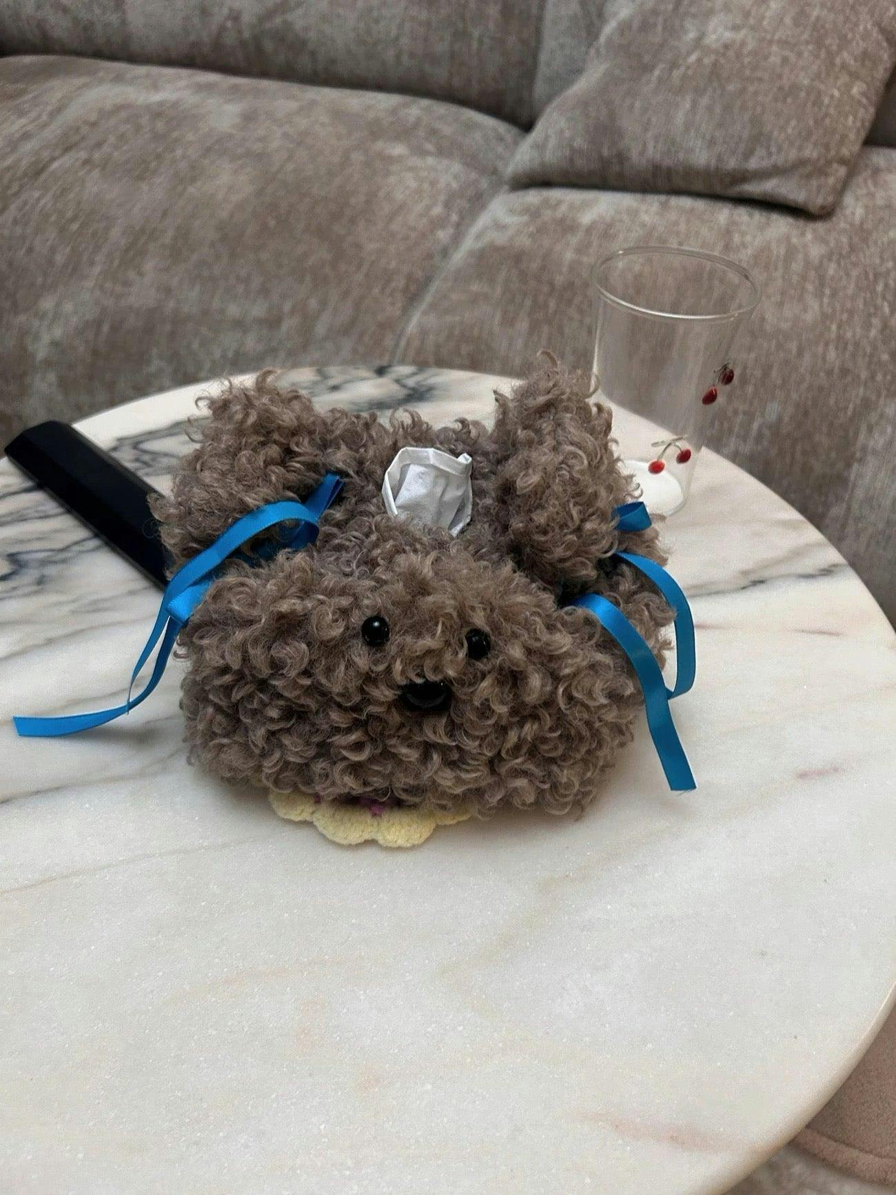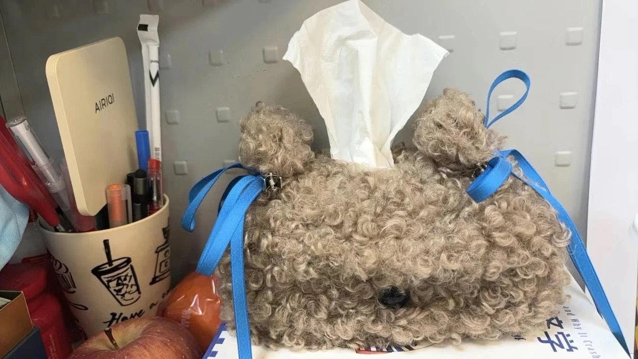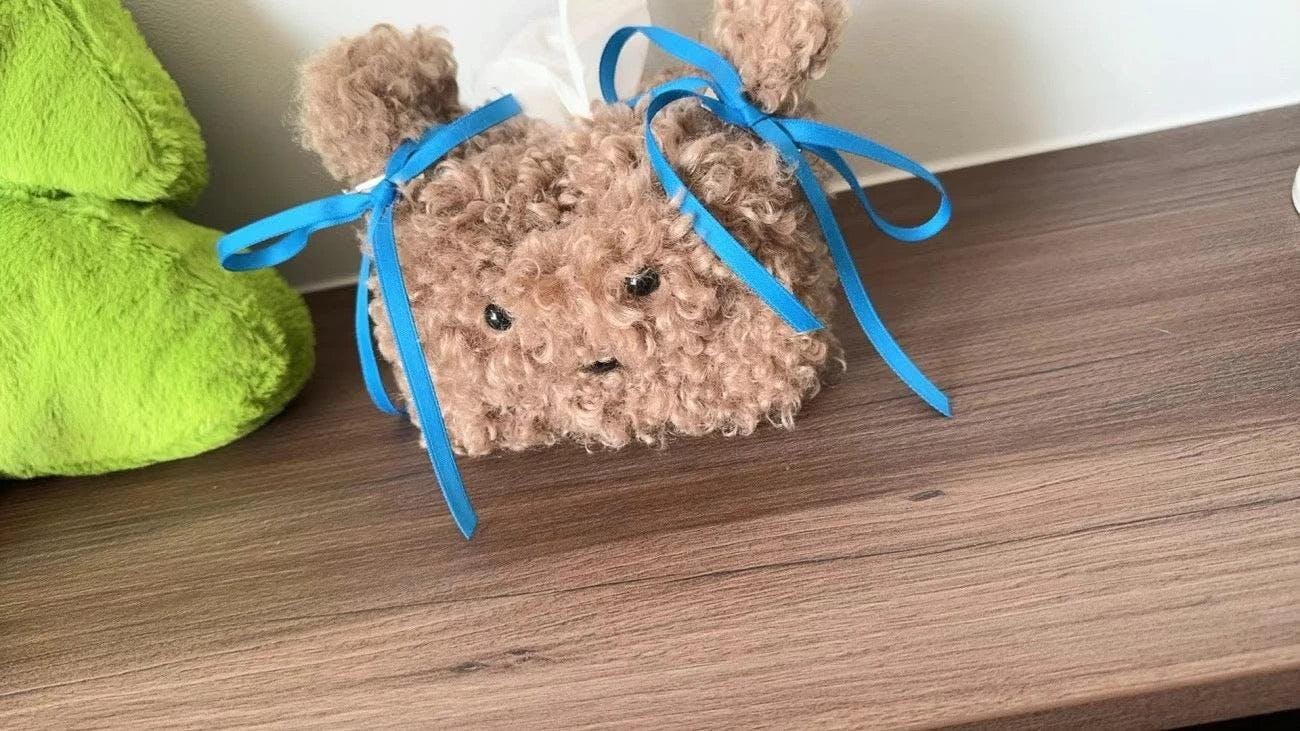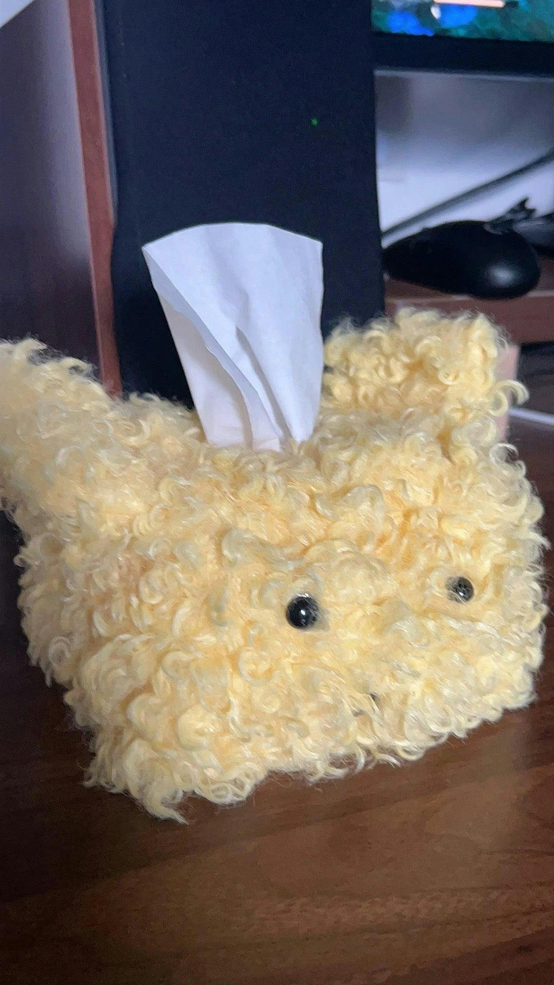 A.P. Cute little pup, fits standard tissue packs perfectly. Soft plush, adds character to my bedside. A tiny bit fluff-shedding at first but nothing major.
