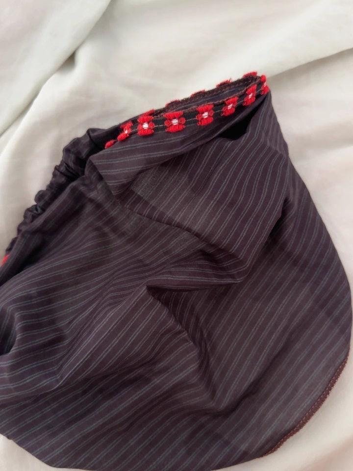 A.R. Soft cotton and stays put all day. Love it for my morning runs.