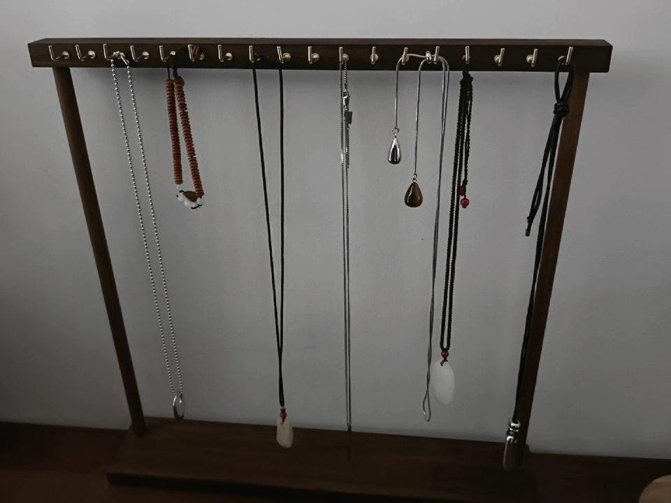 E.T. This stand looks great on my vanity and keeps my necklaces tangle-free. The walnut grain is very warm and premium.